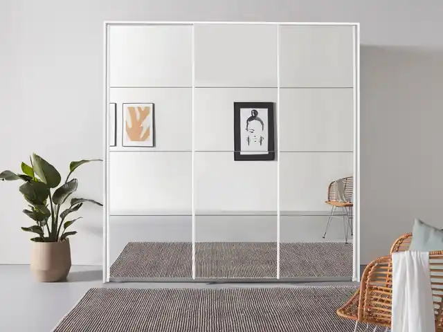Zusätzlich: 2 große Einlegeböden, Wäscheeinteilung mit 3 Innenschubladen – die in der Höhe variabel positioniert werden können -und 2 weiteren Einlegeböden. Inkl. Passepartout, optional mit Beleuchtung. Fachböden und Kleiderstangen können individuell eingesetzt und in der Höhe verstellt werden. rauch Easy-Slide-Funktion für ein sanftes, leises Öffnen der Schwebetüren. 100% Made in Germany, ausgezeichnet mit dem Blauen Engel und dem Goldenen M