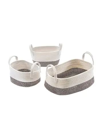 Dieses Baumwollkorbset von Kobolo ist vielseitig verwendbar und schmückt jeden Raum. Die einzelnen Körbe werden in Handarbeit und aus Baumwollseilen vernäht. Diese Universalkörbe können zum Beispiel als Regalkörbe verwendet werden. Auch als Utensilien- oder Allzweckkorb ein echter Hingucker – das Set besteht aus einem großen und zwei kleinen Körben welche praktisch ineinander gesteckt werden können.