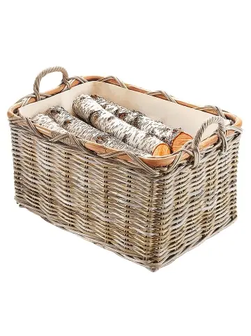 Rechteckiger Holzkorb/Kaminholzkorb in der Trendfarbe Kubu von Kobolo mit 2 Griffen für hohen Komfort beim Tragen und einer Tragfähigkeit von 25 kg. Der moderne Korb ist zusätzlich mit Leinen ausgeschlagen zum Schutz der Wohnung vor Holzrückständen. Der Leinenstoff ist mit einem praktischen Klettverschluß versehen und kann bequem heraus genommen werden. Rattan ist aufgrund seiner natürlichen Beschaffenheit noch immer ein sehr beliebter Werkstoff zur Herstellung von Korbwaren und durch seine hohe Belastbarkeit bietet es Eigenschaften, die denen vieler anderer Materialien überlegen sind.