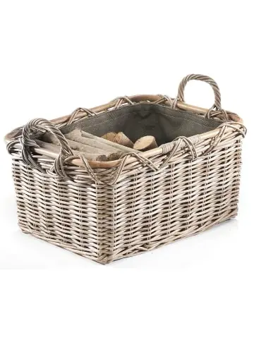 Rechteckiger Holzkorb/Kaminholzkorb in der Trendfarbe Kubu grey mit 2 Griffen für hohen Komfort beim Tragen und einer Tragfähigkeit von 25 kg. Der moderne Korb ist zusätzlich mit dunklem Stoff ausgeschlagen zum Schutz der Wohnung vor Holzrückständen. Der Leinenstoff ist mit einem praktischen Klettverschluß versehen und kann bequem heraus genommen werden. Rattan ist aufgrund seiner natürlichen Beschaffenheit noch immer ein sehr beliebter Werkstoff zur Herstellung von Korbwaren und durch seine hohe Belastbarkeit bietet es Eigenschaften, die denen vieler anderer Materialien überlegen sind.