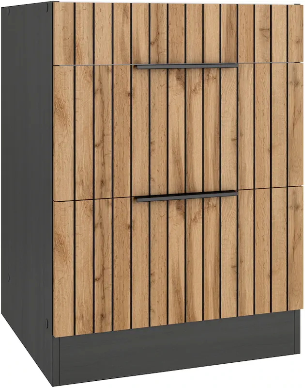 Moderne Akkustikpaneel-Optik. Maße (B/T/H): 60/60/82 cm. Geräumiger Schrank mit viel Stauraum. Vielseitiger Schrank, nutzt den Platz optimal aus. Made in Germany