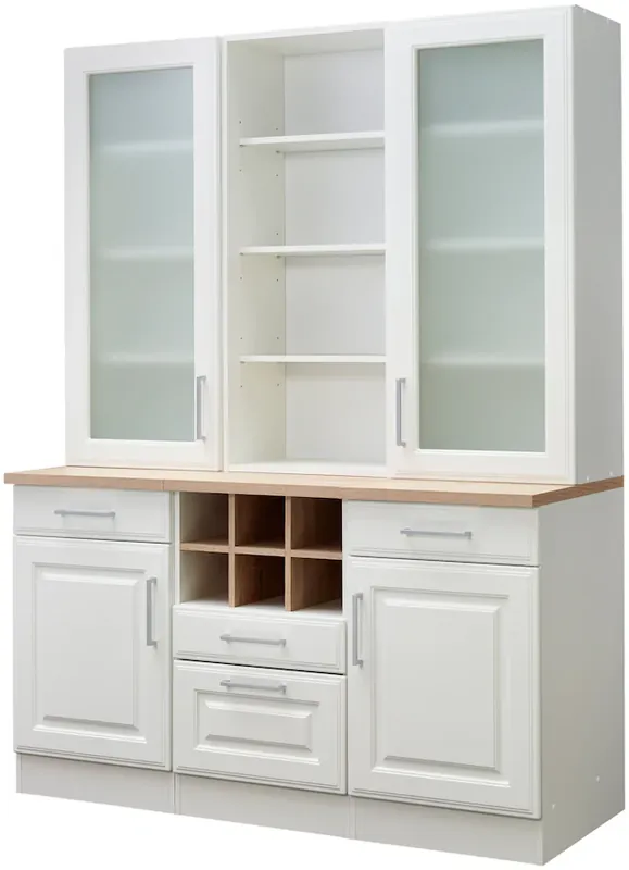 Küchenbuffet mit drei Einlegeböden, drei Schubladen, drei Türen und einem Auszug. Maße (B/T/H): 150/60/200 cm. Hochwertige MDF-Fronten mit aufwendiger Fräsung im Landhausstil. Metallgriffe. Made in Germany