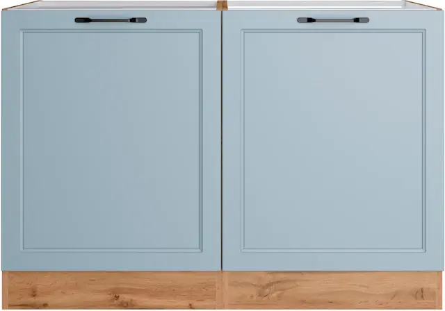 Hochwertig MDF-Fronten in modernen Landhausstil. Beliebig um weitere Schränke erweiterbar. Inklusive rostfreier Edelstahl-Einbauspüle. Schwarze Bügelgriffe aus Metall. Made in Germany