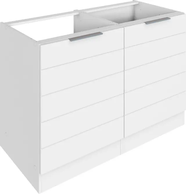 Hochwertige MDF-Fronten mit waagerechter Lisene. Höhenverstellbare Möbelfüße, zum augleichen von Unebenheiten. inklusive Edelstahlspüle. Maße B/T/H ca.: 120/60/82 cm. Made in Germany