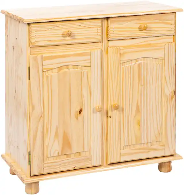 Hochwertiges Massivholz: Gefertigt aus natur lackiertem Kiefernholz – robust, langlebig und mit sichtbarer Holzmaserung für eine warme Ausstrahlung.. Zeitloser Landhausstil: Klassisches Design mit Kugelfüßen und runden Knopfgriffen aus Massivholz – charmant und wohnlich.. Praktischer Stauraum: Zwei Türen, zwei Schubladen und ein Einlegeboden bieten reichlich Platz für Geschirr, Besteck oder Dekoartikel.. Natürliche Optik: Der warme Holzton schafft eine gemütliche Atmosphäre und fügt sich harmonisch in verschiedenste Wohnstile ein.. Vielseitig einsetzbar: Ideal für Esszimmer, Wohnzimmer oder Flur – verbindet Funktionalität mit klassischer Eleganz.