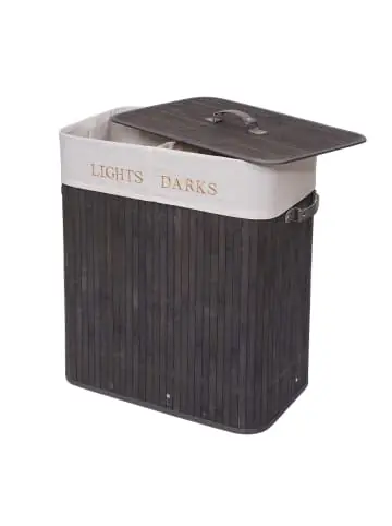 – Markeninhaber TÜV-Süd QM zertifiziert mit Nr. 12 100 59626 TMS für Qualitäts-Management in Deutschland – Füllmenge (ca.): 100l – Zwei Fächer – Mit Bodeneinsatz – Herausnehmbarer Wäschesack – Metallrahmen zur Stabilisierung – Mit Tragegriffen – Mit Trennwand- Schluss mit rumliegender Wäsche! Diese moderne Wäschetruhe hilft Ihnen schmutzige Wäsche ordentlich und sauber zu verstauen. Gleichzeitig lassen sich durch die Trennwand helle und dunkle Kleidungsstücke im Handumdrehen sortieren.- Der schöne Wäschesortierer aus Bambus fügt sich in jeden Raum perfekt ein. Die Handgriffe sorgen für ein bequemes Tragen der Wäschetonne zur Waschmaschine. Der Beutel ist waschbar und durch sein großes Fassungsvermögen lässt sich viel Wäsche verstauen. Maße (ca.):Höhe: 63 cmBreite: 55 cmTiefe: 34 cm Material:Korb: BambusWäschesack: 53% Polyester, 30% Baumwolle, 17% Viskose HINWEIS zum Volumen:Wir geben Ihnen die nutzbaren Liter an. Viele Anbieter geben angebliche Liter an, die bestenfalls ein Außenvolumen darstellen – darin wären dann aber sogar Griffe und heraus stehende Deckel integriert. Das ist für Sie nicht nutzbar. Von einer derart geschönten Darstellung nehmen wir Abstand. Dieser schicke Wäschekorb erfüllt drei Aufgaben in einem, er ist praktisch, dekorativ und dank der Fertigung aus Bambus auch noch ökologisch gut verträglich. Ausgestattet mit einem herausnehmbaren Bodeneinsatz und einem ebensolchen Metallrahmen hat der faltbare Korb einen stabilen Stand. Der zugehörige Wäschesack ist bequem am Korb zu befestigen und sorgt zusätzlich dafür, dass Ihnen kein Wäschestück verloren geht. Die beiden seitlichen Tragegriffe verhelfen zu einem leichten und problemlosen Transport. Wer nicht nur irgendeinen Wäschekorb möchte, sondern einen zugleich nützlichen und optisch ansprechenden Haushaltshelfer, hat hier genau das Richtige gefunden.Versandzustand: Zerlegt–Sicherheitshinweise für Teilartikel mit Artikelnummer 74040 Dieser Artikel ist eine Wäschtruhe / ein Wäschekorb und sollte nur als solcher verwendet werden. Der Artikel ist nur für den Innenbereich geeignet. Überladen Sie den Artikel nicht. Vorsicht: Verletzungsgefahr! Setzen, stellen oder stützen Sie sich nicht auf den Artikel. Vorsicht: Kippgefahr & Verletzungsgefahr! Sorgen Sie immer für einen festen Stand des Artikels.Vorsicht Erstickungsgefahr! Verpackungsmaterial, wie Plastikbeutel, gehören nicht in Kinderhände. Bitte von Babys und Kleinkindern fernhalten! Nicht über den Kopf ziehen! Vorsicht: Verschluckungsgefahr! Achtung dieser Artikel kann verschluckbare Kleinteile enthalten! Halten Sie die Kleinteile von Kindern fern! Prüfen Sie den Artikel regelmäßig alle 3-6 Monate auf Beschädigungen und gelöste Verbindungen. Ziehen Sie lose Schrauben wieder fest an! Sollten Beschädigungen entdeckt werden, darf der Artikel nicht mehr genutzt werden! Benutzen Sie diesen Artikel nur für die bestimmungsgemäße Verwendung, im technisch einwandfreien Zustand und für private Zwecke. Andere Verwendungen gelten als nicht bestimmungsgemäß und können zu schweren Verletzungen und Beschädigungen führen. Für aus bestimmungswidriger Verwendung entstandene Schäden übernimmt der Hersteller keine Haftung.Allgemeine Hinweise: Bitte lesen Sie alle Hinweise sorgfältig durch, bevor Sie den Artikel aufbauen und verwenden. Verwahren Sie die alle Sicherheitsinformationen und Aufbauanleitungen gut auf. Für Ihre eigene Sicherheit und die Ihres Produktes, befolgen Sie bitte die Sicherheitshinweise. Eine falsche Handhabung könnte zu ernsten Verletzungen, beschädigtem Eigentum oder sogar dem Tod hinauslaufen.Pflegehinweise: Saugen Polstermöbel regelmäßig ab. Hat der Artikel einen Bezug pflegen und reinigen Sie diesen entsprechend nach Material (Textil, Leder, Kunstleder). Besteht ihr Möbel aus Holz nutzen Sie einen Staubwedel zur Reinigung. Für alle anderen Oberflächen und bei stärkerem Schmutz können Sie ein nebelfeuchtes Baumwolltuch verwenden. Keinesfalls sollten Sie scharfe oder scheuernde Reiniger verwenden, diese können Schäden verursachen. Für Möbel im Bad: Wasser und Kondenswasser sofort abwischen! Entsorgungshinweise: Entsorgen Sie den Artikel umweltgerecht. Überlegen Sie Alternativen zu Entsorgung wie Spenden oder Verkaufen. Elektrische Artikel gehören nicht in den Hausmüll. Entsorgen Sie diese an einem Recyclinghof für elektrische und elektronische Altgeräte, weitere Informationen erhalten Sie bei Ihrer örtlichen Gemeindeverwaltung. Einlagerungshinweise: Der Artikel sollte trocken und sauber sein, verwahren Sie diesen geschützt in dem Karton in dem er geliefert wurde.