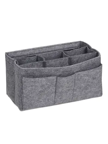 Sucht man in der Handtasche nach Schlüssel, Geldbörse, Lippenstift oder Handy, ist das vor allem bei größeren Taschen ohne Innentasche oft mit lästigem Kramen verbunden. Dagegen hilft der Taschentrenner aus Filz. All Ihre Utensilien können Sie in die vielen kleinen Fächer des Handtascheneinsatzes übersichtlich einsortieren und finden sie so auch jederzeit schnell wieder. Beim Wechseln der Handtasche entnehmen Sie einfach den kompletten Taschenorganisator und packen ihn schnell um.Taschenorganizer im Detail – Größe S H x B x T: ca. 16 x 27 x 16 cm / ca. 0,24 kg- Größe M H x B x T: ca. 17 x 29 x 19 cm / ca. 0,28 kg- Größe L H x B x T: ca. 17,5 x 32 x 20 cm / ca. 0,33 kg- Material: Filz – Farbe: DunkelgrauTascheneinsatz für Handtaschen – Mit 4 Außentaschen, 3 Innentaschen und entnehmbarem Mitteltrenner- Sorgt für Ordnung in der Handtasche – Kein Kramen nach Utensilien mehr – Ordentliches Verstauen von Kosmetik, Geldbeutel, Schlüssel, Handy uvm.- Aus weichem, robustem und stabilem Filzstoff, der Ihre Utensilien schützt – Ermöglicht schnelles Wechseln der Handtasche ohne ewiges Umpacken – Kann auch in Wickeltasche, Strandtasche, Rucksack etc. verwendet werdenLieferumfang – 1x Handtaschenordner in Größe nach Wahl – Dekoartikel sind im Lieferumfang nicht enthalten