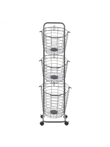 Badezimmer Korbständer im 3er Set auf Rollen. Fehlt Ihnen ein wenig Stauraum im Badezimmer oder in der Küche? Möchten Sie Ihre Utensilien, Handtücher und Kleinigkeiten immer griffbereit haben? Wenn ja, dann ist dieser Korbständer wie für Sie gemacht. Die drei Körbe aus pulverbeschichtetem Metall sind äußerst geräumig und können auch separat aus dem Ständer genommen werden. Dank den angebrachten Plastikrollen kann der Ständer mit Leichtigkeit überall hin platziert werden.Details: Typ: Bad-Kleinaufbewahrung Stil: Industriell Farbe: Grau Material: Eisen Zusätzliches Material: Kunststoff Finish: PulverbeschichtetDimensions: Tiefe: 37 cm Breite: 37 cm Höhe: 123 cm Gewicht: 3.5 kgSie kaufen: 1 x Ständer, 3 x MetallkorbProduktvorteile: Leicht transportierbar dank der Rollen, Zeitloses Design, Leichtes und zugleich strapazierfähiges Material, Multifunktional, Viel StauraumMontage: Nicht montiert. 5 – 15 Min.Pflegeanleitung:Metall: 1.Bitte ausschließlich handelsübliche, milde Reinigungsmittel und weiche Tücher verwenden, wobei feuchte Stellen sofort trocken gerieben werden sollten 2.Vermeiden Sie scheuernde Reiniger, da diese die Oberfläche beschädigen können 3.Bei Chrom und Kupfer regelmäßig mit speziellen Pflegemitteln polieren.Kunststoff: 1.Bitte ausschließlich milde Reinigungsmittel und weiche Tücher verwenden. Feuchte Stellen sofort trocken reiben.