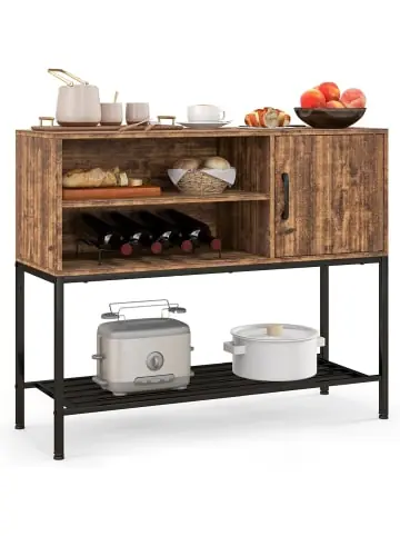 Beschreibung: Werten Sie Ihre Hausbar mit unserem industriellen Buffet-Sideboard auf! Dieser Konsolentisch bietet ausreichend Stauraum, um Gegenstände in Reichweite aufzubewahren. Das untere Metallregal bietet einfachen Zugang zu verschiedenen Arten von Utensilien. Darüber hinaus sorgen der robuste Metallrahmen und die verstellbaren Fußpolster für Stabilität. Entworfen für Stabilität & Sicherheit sind Kippschutzvorrichtungen enthalten. Dieser Buffet-Sideboard-Tisch ist eine perfekte Ergänzung für jeden Raum, wie die Küche, das Esszimmer, das Wohnzimmer oder den Eingangsbereich.Eigenschaften: Herausnehmbare Weinregale für individuelle Aufbewahrung von Weinflaschen Schrank mit Tür bietet geschlossenen Stauraum für private Gegenstände Metallregal bietet Ihnen eine zusätzliche Aufbewahrungsoption Solider und rostfreier Metallrahmen für langanhaltende Nutzung Kippschutzvorrichtungen für zusätzliche Sicherheit Verstellbare Fußpolster funktionieren gut auf unebenem Untergrund Materialien: MDF, Holzwerkstoff, Metall Produktmaße: 100 x 35 x 83 cm (L x B x H) Größe des offenen Fachs: 60 x 33,5 x 16 cm (L x B x H) Größe der Tür: 35 x 33,5 cm (L x B) Größe des Metallregals: 90 x 34 cm (L x B) Höhe vom Metallregal zum Schrankboden: 32 cm Bodenfreiheit: 11 cm Nettogewicht: 20 kg Tragfähigkeit der Tischplatte: 50 kg Tragfähigkeit des Holzregals: 30 kg Tragfähigkeit des Metallregals: 30 kgLieferungsumfang: 1 x Sideboard 1 x Anleitung