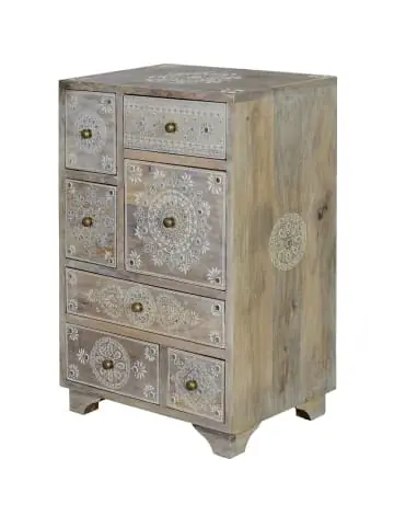 Beistellmöbel und Telefonmöbel mit 7 Aufbewahrungsschubladen. Handgefertigt aus massivem Mangoholz mit originellen handbemalten Details. Höhe der Beine: 5 cm. Maße: 66 x 42 x 30 cm. Kartongröße: 73 x 37 x 48 cm. Gewicht: 15 kg. Da es sich um ein Möbelstück aus natürlichem Holz in handwerklicher Herstellung handelt, können Maserungen und Äste sichtbar sein und es kann zu Farbabweichungen kommen. Wood