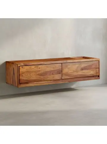 DesignHängender TV-Unterschrank in modernem DesignPraktische Vertiefung für Fernbedienungen und KopfhörerAusgestattet mit zwei geräumigen SchubladenRechteckige Ablagefläche bietet viel Platz für Ihren FernseherAbmessungenBreite: 108 cmHöhe: 25 cmTiefe: 34 cmStellflächenbreite für Fernseher: ca. 83 cmVertiefung in der Ablage (BxHxT): 21 x 1,5 x 26 cmInnenmaße je Schublade (BxHxT): 45,5 x 13,5 x 24 cmMaterialstärke: 1,5 cmFarbeKomplettes TV-Board: BraunBesonderheitenJedes Lowboard wurde in liebevoller Handarbeit gefertigt und ist somit ein absolutes UnikatDie Fernsehkommode ist bis zu einer TV Größe von 50 Zoll geeignet (auch für größere Fernseher geeignet, bitte Beinabstand des TV-Geräts beachten)Holzschutz bietet die Schutzlackversiegelung der OberflächenDie Schubladen sind ideal für Konsolenspiele und DVDsEmpfohlene Maximalbelastbarkeit: 15 kgMaterialKorpus: Sheesham Massivholz, mit Klarlack beschichtetRückwand: MDFLieferumfangEin Lowboard ohne DekorationMontagematerial für die Wandbefestigung ist nicht im Lieferumfang enthalten, da dieses von der Wandbeschaffenheit abhängig istMontageLieferzustand: komplett montiert und sicher verpacktPflegehinweiseDie Oberfläche mit einem lauwarm angefeuchteten Baumwolltuch reinigen. Keine Scheuermittel, scharfe Reinigungsmittel oder tropfnasse Tücher verwenden.