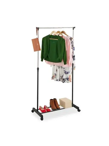 Die rollbare Kleidergarderobe mit höhenverstellbarer Wäschestange schafft praktischen Stauraum im Flur oder Schlafzimmer. Jacken, Hemden, Blusen, Kleider und mehr sind mithilfe von Kleiderbügeln schnell und übersichtlich an der Garderobenstange aufgehängt. 2 Seitliche Haken bieten Platz für Taschen und Schals. Der schlichte Kleiderwagen ist einfach aufgebaut, kann dank seiner 4 Rollen flexibel bewegt werden und eignet sich so auch wunderbar für Deinen nächsten Stand auf dem Flohmarkt.Kleiderständer im Detail- Maße B x T: ca. 76 x 40,5 cm – Mögliche Höhen: ca. 91- 156 cm – Kleiderstange B x D: ca. 72 x 2 cm- Rollen D: ca. 4 cm – Traglast: max. 8 kg – Gewicht: ca. 1,1 kg- Material: Stahl, Kunststoff – Farbe: Schwarz, SilberRollkleiderständer mit verstellbarer Stange – Für Flur, Diele, Ankleidezimmer und Schlafzimmer- Auch geeignet als Garderobenständer auf dem Flohmarkt – Verstellbare Kleiderstange auf Wunschhöhe bringen – Zum Aufhängen von Jacken, Blusen uvm. mit Kleiderbügeln – Seitliche Haken ideal für Schals und Handtaschen – Unten Aufbewahrungsbox, Schukarton o. Ä. abstellen – Mobil dank 4 Rollen – Feststellbremsen für sicheren Stand- Ohne Bohren freistehend platzierbar – Schneller AufbauLieferumfang – 1x Kleidungsständer in Einzelteilen – Anleitung und Montagematerial – Dekoartikel sind im Lieferumfang nicht enthalten