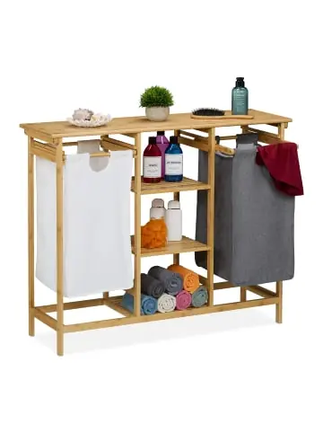 Verstaue Deine Schmutzwäsche ordentlich bis zum nächsten Waschgang. Zwei ausziehbare Wäschekörbe ermöglichen das diskrete Aufbewahren und Vorsortieren Deiner Schmutzwäsche. Gleichzeitig wird Dir durch die eine große und 3 kleine Ablagen zusätzlicher Stauraum für Handtücher, Waschmittel und mehr geboten. Das moderne Design und der Materialmix aus Bambus und Stoff-Wäschesäcken machen die praktische Kombination aus Wäschesortierer und Badregal zum Hingucker in Deinem Schlaf- oder Badezimmer.Wäschekorbregal im Detail – Gesamtmaße H x B x T: ca. 80 x 100 x 32 cm – Fassungsvermögen pro Wäschesack: ca. 34 l – Material: Bambus, Polyester – Gesamtgewicht: ca. 8,6 kg – Farbe: Natur, Grau, WeißBadregal zum Vorsortieren von Wäsche – Große Ablagefläche B x T: ca. 100 x 32 cm – Traglast große Ablage: ca. 15 kg – Kleine Ablageflächen B x T: ca. 29 x 30 cm – Traglasten kleine Ablagen: ca. 5 kg – Traglast der Wäschesäcke: je ca. 10 kgPraktischer Wäscheschrank im Materialmix – Platzsparende Kombi aus Regal und Wäscheaufbewahrung – Große Ablageflächen für Handtücher, Deko und Waschmittel – 3 kleine Ablagen schaffen zusätzlichen Stauraum – Mit 2 herausziehbaren Wäschekörben aus Stoff in Grau und Weiß – Diskrete Schmutzwäscheaufbewahrung in Bad oder Schlafzimmer – Ordnungshelfer zum Vorsortieren Deiner SchmutzwäscheLieferumfang – 1x Wäschekorbregal in Einzelteilen – Inklusive Anleitung und Montagematerial – Dekoartikel sind nicht im Lieferumfang enthalten