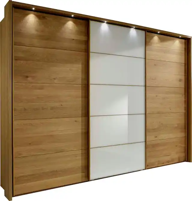 Hochwertige widerstandsfähige Front. In Breite 330 cm mit Synchronauszug. Mit 2 Massivholztüren. Maße (T/H): je 67/220 bzw. 240 cm. Ohne Passepartout-Rahmen und Beleuchtung