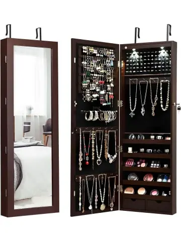 Beschreibung: Wenn Sie noch nach einem hübschen und platzsparenden Schmuckschrank mit großer Kapazität suchen, dann ist unser Schrank mit LED-Lichtern die perfekte Wahl! Gefertigt aus hochwertigen MDF-Platten mit Finish kann er langfristig verwendet werden. In dem großen Spiegel können Sie sich von Kopf bis Fuß betrachten. Innen finden sich 50 Ringfächer, 1 Stange, 5 Einlegeböden, 2 Schubladen, Halskettenhaken und Ohrringhaken, sodass Sie Ihren Schmuck sortiert aufbewahren können. Durch die LED-Lichter finden Sie Gesuchtes auf einen Blick. Auch lässt sich der hübsche Schrank in alle möglichen Einrichtungen integrieren, sei es im Schlafzimmer oder Ankleidezimmer. Sie sollten ihn wirklich nicht verpassen!Eigenschaften: Design zur Wand-/Türmontagespart viel Platz Abschließbar für eine sichere Aufbewahrung von Schmuck Ordentliche Aufbewahrung Großer Glasspiegel in für eine Ansicht von Kopf bis Fuß 2 romantische LED-Lichter (Batterien nicht enthalten) für eine warme Atmosphäre Hochwertige MDF-Konstruktion für Stabilität und Langlebigkeit Stilvolles Finish für Eleganz und eine leichte Reinigung Samtauskleidung zum Schutz des Schmucks vor Kratzern Verstellbare Haken ermöglichen eine individuelle Anpassung der Höhe Mit 50 Ringfächern, 1 Stange, 5 Einlegeböden, 2 Schubladen, Halskettenhaken und Ohrringhaken Einfaches, aber hübsches Aussehen, passend zu jeder Einrichtung Material: MDF, Glas, Samt Typ: Wand-/Türbefestigung Batterie-Typ: 3 × AAA (nicht inklusive) Gesamtmaße: 108 cm × 37 cm × 9,5 cm Größe des Spiegels: 28 cm × 101 cm Produktgewicht: 9,5 kgLieferungsumfang: 1 × Schmuckkabinett 2 × Haken 1 × Zubehörbeutel 1 × Anleitung