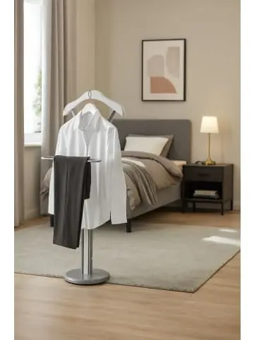 Funktioneller, praktischer Herrendiener mit einem stabilen, standfesten Gestell aus Stahlrohr, pulverbeschichtet. Unten runder Standfuß, oben Hosenbügel- und Kleider-/Jackenbügelhalterung und Ablageschale. Kleiderbügel, Mittelteil und Ablageschale aus MDF, lackiert. Lieferung erfolgt zur Selbstmontage, inklusive Aufbauanleitung. Maße ca. cm: (B/H/T) 48/108/28. Lieferbar in drei aktuellen Farben.- Mit Hosenhalter- Mit Blusen-/Hemdenbügel- Praktische Ablageschale