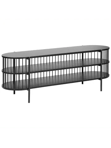 Moderner Retro Gitter-Optik Fernsehschrank mit offenen Regalen. Dieser schmale, türlose Fernsehtisch ist für alle Räume gedacht, in denen Sie nicht nur Abstellfläche, sondern auch stilvolle Eleganz benötigen. Der klassische Farbton, kombiniert mit der ovalen Tischplatte und dem anziehenden Gitter-Design, sorgt für Retro-Raffinesse, während die schlanken Metallbeine angemessene Stabilität versprechen. Dank der robusten Materialwahl und glatten Oberflächen ist das Lowboard äußerst langlebig und pflegeleicht. Unter der Tischplatte finden Sie zwei offene Regale, die perfekt für Bücher, Fernbedienungen, Spielekonsolen oder viele andere Schmuckstücke geeignet sind.Details: Typ: TV-Möbel Farbe: Schwarz Material: MDF-Platte Zusätzliches Material: Eisen Gestellmaterial: Holzwerkstoff Anzahl Einlegeböden: 2 Schubladen: Nein Finish: PulverbeschichtetDimensions: Tiefe: 44 cm Breite: 140 cm Höhe: 50 cm Gewicht: 18 kg Max. Belastung pro Fach: 5 kg Max. Belastung der Oberplatte: 20 kgSie kaufen: 1 x TV-MöbelProduktvorteile: Leicht zugängliches, offenes Regal, Elegantes Design, Verleiht jedem Raum eine einzigartige Note, Robustes Gestell, Moderne Ausstrahlung und langjährige QualitätMontage: Nicht montiert. 20 – 40 Min.Zusatzinformationen: Um die Haltbarkeit und die Ästhetik der Arbeitsplatte zu erhalten, sollte man Platzsets und Untersetzer verwenden und feuchte Stellen schnellstmöglich trocken wischen, um Produktschäden zu vermeiden.Pflegeanleitung:MDF-Platte: 1.Bitte ausschließlich milde Reinigungsmittel und weiche Tücher verwenden. Feuchte Stellen sofort trocken reiben.Eisen: 1.Bitte ausschließlich handelsübliche, milde Reinigungsmittel und weiche Tücher verwenden, wobei feuchte Stellen sofort trocken gerieben werden sollten 2.Vermeiden Sie scheuernde Reiniger, da diese die Oberfläche beschädigen können 3.Bei Chrom und Kupfer regelmäßig mit speziellen Pflegemitteln polieren.