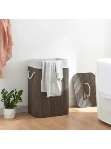 Wäschekorb Der elegante und praktische Wäschesammler ist ideal für Ihren Haushalt. Er macht das Sammeln Ihrer schmutzigen Wäsche zum Kinderspiel und sorgt somit für Ordnung in ihrem Zuhause. Der Wäschebehälter bietet durch seine großzügigen Abmessungen und dem herausnehmbaren Wäschesack ausreichend Platz für Ihre Wäsche, wodurch Sie sich keine Sorgen mehr machen müssen, dass schmutzige Kleidung herumliegt. Der Deckel verhindert zudem unangenehme Gerüche durch Schmutzwäsche. Egal ob im Schlafzimmer, Badezimmer oder in der Waschküche – unsere Wäschebox fügt sich nahtlos in jede Umgebung ein. Mit ihrem schlichten und dennoch stilvollen Aussehen ergänzt sie die Einrichtung Ihres Hauses auf elegante Art und Weise. Produkt-Highlights: – Eleganter und praktischer Wäschesammler – Herausnehmbarer Wäschebeutel für einfache Handhabung – Griffe an den Seiten für unkomplizierten Transport – Deckel verhindert unangenehme Gerüche – Natürliches und umweltfreundliches Material – Schafft Ordnung im Haushalt Fassungsvermögen: 72 L Material: – Wäschekorb: Bambus – Wäschesack: 100% Polyester Maße (HxBxT): 60 x 40 x 30 cm Farbe: – Wäschekorb: Dunkelbraun – Wäschesack: Hellgrau Lieferumfang: – 1 x Wäschekorb – 1 x Einhängbarer Wäschesack Markenware aus dem Hause: [en.casa]
