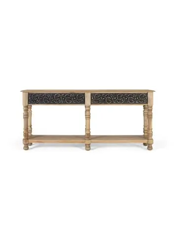 Diese imposante Flurkonsole ist aus Mangoholz gefertigt. Die natürliche Oberfläche hebt die Maserung und Nuancen des Holzes hervor. Das Stück verfügt über eine breite Oberseite mit einer umlaufenden Formgebung und seine doppelt patinierte graue Vorderseite fällt auf und erzeugt einen attraktiven Kontrast. Seine Struktur wird von sechs gedrechselten Beinen mit eleganten Formen und ausgewogenen Proportionen getragen. Unten bietet ein durchgehendes Regal zusätzlichen Platz für Dekoration oder Aufbewahrung und sorgt für Funktionalität, ohne die optische Leichtigkeit des Ganzen zu beeinträchtigen. REGALHÖHE: 47 cm, BEINHÖHE: 10 cm, REGALMAß: 174 x 34 cm, DECKEL: 1,6 cm Wood