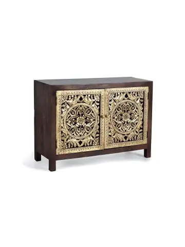 Kommode aus Mangoholz mit handgefertigten Bronzedetails. Naturholz kann Unterschiede in Farbe, Maserung und Struktur aufweisen. Wood