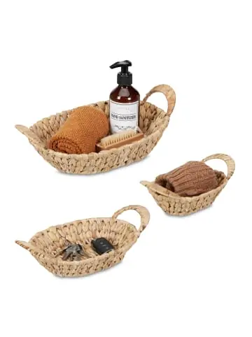 Mit dem 3er Set Aufbewahrungskörbe aus natürlicher Wasserhyazinthe sorgst Du nicht nur für mehr Ordnung, sondern schaffst auch einen tollen Blickfang im Boho-Stil. In den geflochtenen Badorganizern finden Bad- und Küchenutensilien, Schlüssel und andere Kleinteile Platz. Nutze die ovalen Dekokörbe als praktische Ordnungshelfer im Wohnzimmer, Bad oder Schlafzimmer. Mit den zwei Griffen können die Flechtkörbe einfach transportiert werden. Bei Bedarf kannst Du die Körbe einfach ineinander stapeln.Aufbewahrungskörbe im Detail – Großer Korb H x B x T: ca. 11,5 x 35 x 22 cm, 260 g – Mittlerer Korb H x B x T: ca. 9 x 30 x 17,5 cm, 190 g – Kleiner Korb H x B x T: ca. 7,5 x 21,5 x 13 cm, 140 g – Material: Wasserhyazinthe, Eisen – Farbe: NaturGeflochtene Dekokörbe aus Pflanzenfaser – Praktisches Set aus Körben in 3 verschiedenen Größen – Zum Verstauen von Badartikeln, Schlüsseln, Kleinteilen uvm. – Ideal für mehr Ordnung im Bad, Wohn-, Schlafzimmer etc. – Aus Wasserhyazinthe – Toll für Einrichtungen im Boho-Stil – Integrierte Griffe für leichtes Hochheben und Transportieren – Flechtkörbe sind bei Bedarf einfach ineinander stapelbarLieferumfang – 3x Aufbewahrungskorb – Dekoartikel sind nicht im Lieferumfang enthalten