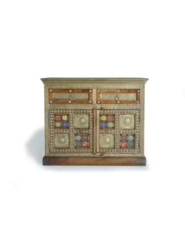 Kommode im Ethno-Stil aus massivem Akazienholz, dekoriert mit Keramik- und Bronzereliefs. Mit zwei Schubladen und zwei Türen, verleiht dem Raum einen Hauch von Eleganz und Authentizität. Maße: 90 x 105 x 40 cm. Gewicht: 45 kg. Verpackungsmaße: 97 x 114 x 49 cm. Lieferung in einem Paket. Naturholz und Handarbeit, daher mögliche Abweichungen in Farbe und Maserung. Wood