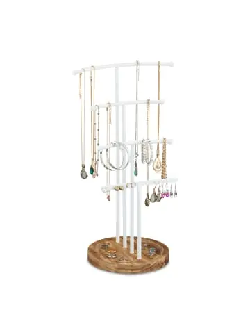 Mit diesem Schmuckhalter gehören verknotete Ketten der Vergangenheit an. Der Schmuckorganizer verfügt über 3 T-förmige Stangen in unterschiedlichen Höhen und bietet ausreichend Platz für Ketten und Armbänder in verschiedenen Längen. Auch Ohrstecker lassen sich ordentlich im Ohrringhalter verstauen. Zusätzlich schafft die praktische Ablage der Schmuckaufbewahrung Platz für Ringe, Uhren oder Kosmetik. Die Kombination aus Holz und Metall macht den Schmuckständer zu einem dekorativen Blickfang.Schmuckständer im Detail – Maße H x B x T: ca. 43 x 24 x 18 cm – Stangen H: ca. 25 / 32,5 / 41 cm – Abstand zwischen Stangen: ca. 3 cm – Gewicht: ca. 0,4 kg – Material: Eisen, Buchenholz – Farbe: Weiß, BraunVielseitiger Schmuckhalter mit Ablage – Zur übersichtlichen Schmuckaufbewahrung – T-förmige Stangen in unterschiedlichen Höhen – Ideal geeignet für Halsketten und Armbänder – Mit praktischer Stange für 18 Ohrstecker – Ablage für Uhren, Ringe, Kosmetikartikel uvm. – Moderner Materialmix aus Buchenholz und EisenLieferumfang – 1x Schmuckaufbewahrung in Einzelteilen – Dekoartikel sind nicht im Lieferumfang enthalten