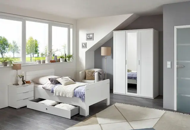 Mitteltüren mit Spiegel-Auflage. Edle Kranzleiste. Außentüren mit Aufleistungen. Tiefe/Höhe: 58/212 cm
