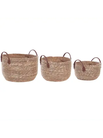 Runde, handgefertigte Körbe aus Seegras mit praktischen Tragegriffen. Mit diesem stilvollen Set schaffen Sie Ordnung in Ihrem Zuhause. Die Aufbewahrungskörbe sind aus langlebigem Seegras gefertigt, was ihnen einen einzigartigen Look verleiht und sie zu einer tollen Ergänzung für Boho und rustikale Interieurs macht. Stellen Sie die Mehrzweck-Körbe in Ihrem Wohn- oder Schlafzimmer auf und nutzen Sie sie als Stauraum für zusätzliche Decken oder Kissen. Dank den Griffen aus hochwertigem Kunstleder können Sie die Dekokörbe an jeden Platz transportieren. Außerdem lassen sich die Seegraskörbe platzsparend ineinander verstauen.Details: Typ: Bad-Kleinaufbewahrung Farbe: Naturfarben Material: Seegras Zusätzliches Material: Kunstleder Form: Rund Handgefertigt: NeinDimensions: Tiefe: 26/31/36 cm Breite: 26/31/36 cm Höhe: 17/21/24 cm Gesamtmasse: 36x36x24 Gewicht: 1.4 kgSie kaufen: 3 x KorbProduktvorteile: Wunderbar geeignet für Schlaf- und Wohnbereich, Hochwertiges Material, Ausgestattet mit Tragegriffen, Multifunktional, Praktischer, großer StauraumMontage: Benötigt keine MontagePflegeanleitung:Seegras: 1.Die Reinigung sollte ausschließlich mit einem weichen, trockenen Tuch und ohne Reinigungsmittel erfolgen.