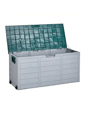 Kunststoff Aufbewahrungsbox mit Rollen. Mit dieser geräumigen Aufbewahrungsbox können Sie Ihre Gartengeräte, Outdoor-Kissen oder Regenabdeckungen, wenn Sie sie nicht benötigen, leicht verstauen. Aus langlebigem synthetischem Material gefertigt, benötigt die Box keine tägliche Pflege, um viele Jahre lang zu halten. Dank des Deckels, der den oberen Teil des Behälters abdeckt, werden die darin aufbewahrten Gegenstände nicht schmutzig. Die Aufbewahrungsbox ist mit Griffen und Rollen ausgestattet, so dass Sie sie leicht und immer, wann Sie möchten, bewegen können.Details: Typ: Truhe Farbe: Grau Material: Kunststoff Volumen: 245Dimensions: Tiefe: 50 cm Breite: 112 cm Höhe: 53 cm Gewicht: 8 kg Max. Belastung: 100 kgSie kaufen: 1 x AufbewahrungsboxProduktvorteile: Leichtgängige Nylon Laufrollen, Modernes Design, Besonders pflegeleicht und langlebig, Ausgestattet mit Tragegriffen, Unkomplizierte SelbstmontageMontage: Nicht montiert. 20 – 40 Min.Pflegeanleitung:Kunststoff: 1.Die Reinigung kann mit handelsüblicher milder Seifenlauge und einem weichen Tuch erfolgen 2.Die Verwendung eines Grills in der Nähe des Möbelstücks sollte mit grösster Vorsicht geschehen, da Funken der Holzkohle stellenweise Beschädigungen verursachen können. Legen Sie aus diesem Grund auch keine heissen Grillzangen und Spiesse auf die Tischplatte 3.Das Material ist extrem witterungbeständig. Jedoch empfehlen wir für die Wintersaison eine Schutzhülle zu verwenden oder, wenn möglich, die Möbel trocken und kühl drinnen zu lagern.