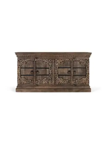 Ein stattliches Sideboard aus massivem Mangoholz in robustem und elegantem Design. Es verfügt über vier reich verzierte Vordertüren mit floralen Motiven und ornamentalen Rahmen. Die Türen sind mit horizontalen Metallbändern und gealterten Eisenringgriffen verstärkt. Im Inneren bietet es großzügige Ablageflächen. Der erhöhte Sockel sorgt für Stabilität und eine solide, ausgewogene Ästhetik. Perfekt für Wohnzimmer, Esszimmer oder Eingangsbereiche mit rustikalem, kolonialem oder traditionellem Dekor. TÜRGRÖSSE: 59 x 41 cm, REGALHÖHE: 29 cm, INNENREGAL: 83 x 32 cm, OBERFLÄCHE: 7 cm Wood