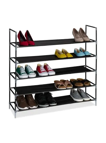 Mit diesem platzsparenden Schuhregal gehören herumliegende Schuhe der Vergangenheit an. Die Schuhablage ist ideal für den Flur, das Schlaf- oder Ankleidezimmer. Pro Ebene können dabei 4 Paar Schuhe verstaut werden. So hast Du mit dem Schuhständer Dein liebstes Schuhwerk passend zum Outfit oder Wetter jederzeit griffbereit. Das praktische Schuhgestell mit Stecksystem ist schnell aufgebaut. Das schlichte Design aus Metallgestell und Stoffablagen fügt sich vielseitig ein.Schuhregal im Detail – Ablagefläche B x T: ca. 88 x 27 cm – Abstand der Ablagen: ca. 16 cm – Traglast je Ablage: max. 5 kg – Materialien: Stahl, Vlies, PP – Farbe: Schwarz, TransparentSchuhgestell in verschiedenen Größen – Maße 3 Ebenen H x B x T: ca. 58 x 100 x 28 cm / ca. 0,9 kg – Maße 4 Ebenen H x B x T: ca. 75 x 100 x 28 cm / ca. 1,1 kg – Maße 5 Ebenen H x B x T: ca. 91 x 100 x 28 cm / ca. 1,4 kg – Maße 6 Ebenen H x B x T: ca. 108 x 100 x 28 cm / ca. 1,7 kgSchuhständer für den Flur – Zur Aufbewahrung von 4 Paar Schuhen pro Ebene – Platzsparende Schuhablage durch schmales Design – Offenes Schuhgestell für schnellen Zugriff – Schwarzes Metallgestell mit Ablagen aus Stoff – Schneller, unkomplizierter Aufbau mit Stecksystem – Mit Wandmontagematerial für mehr StabilitätLieferumfang – 1x Schuhorganizer in Einzelteilen – Mit Anleitung – Mit Montagematerial – Dekoartikel sind nicht im Lieferumfang enthalten