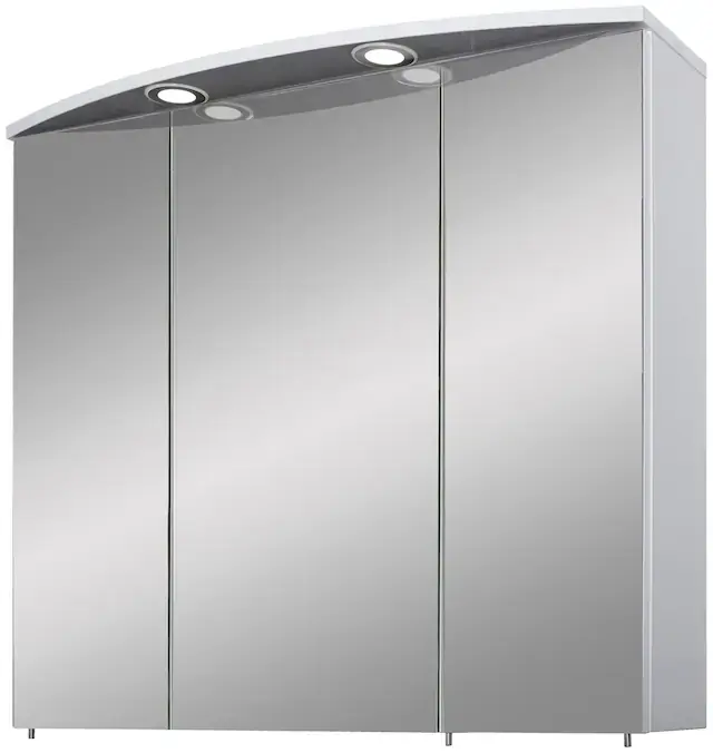 Modernes Design. Einseitig verspiegelte Türen. LED-Strahler. Material: melaminharzbeschichteteSpannplatte. Badmöbel Made in Germany