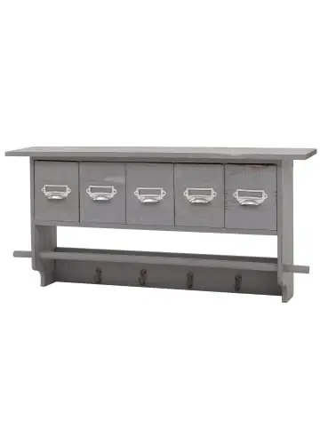 – Markeninhaber TÜV-Süd QM zertifiziert mit Nr. 12 100 59626 TMS für Qualitäts-Management in Deutschland – Lieferumfang: 1x Garderobe – Komplett fertig montiert – 5 Schubladen mit Einschüben für Einsteckschilder – 4 Haken – Kleiderstange für Kleiderbügel – Material: Massives Paulowniaholz – Große Ablagefläche – Mit vielen unserer Shabby-Angebote kombinierbarMaße (ca.):Höhe: 32 cmBreite: 65 cmTiefe: 13 cmLänge Kleiderstange: 62,5 cmØ Kleiderstange: 1,6 cm Ablagefläche oben:Breite: 65 cmTiefe: 13 cm Innenmaße Schublade:Höhe: 11,5 cmBreite: 8 cmTiefe: 8,5 cm Einschub für Einsteckschilder:Höhe: 1,7 cmBreite: 5 cmEinsteckschilder sind nicht im Lieferumfang enthalten Material:Garderobe: Paulownia HolzKleiderhaken: Metall in Messing-Optik Hübsch hässlich, schick schäbig, Trash ist das neue Neu – und vor allem der allerletzte Schrei!! Wir präsentieren: den Shabby-Look. Lassen Sie sich von der lädiert anmutenden Oberfläche nicht täuschen, die Produkte dieser Serie sind qualitativ hochwertig verarbeitet und wurden nur aus den besten Materialien gefertigt. Die Holzelemente wurden hauptsächlich aus der Paulownie hergestellt, einem auch schon in Europa kultivierten Wertholzbaum, der aufgrund seiner Leichtigkeit und hohen Stabilität auch als das Aluminium der Hölzer bezeichnet wird. Die gebürstete Oberfläche verleiht jedem einzelnen unserer Shabby-Produkte einen ganz eigenen, individuellen Used-Look, der einerseits rustikal, andererseits aber auch spielerisch leicht wirkt und sich somit nahtlos in jede Umgebung einfügt, es aber auch schafft Akzente zu setzen. Ihrer Kreativität sind hier keinerlei Grenzen gesetzt. Die universelle Möbelserie im Vintage-Look. Sie wünschen von einer Wand mehr als nur Ihr Haus zusammen zu halten? Mit dieser Wandgarderobe können Sie jede Wand praktisch und dekorativ aufwerten! Durch den Shabby-Look wirkt jeder Flur, jede Diele oder auch das Schlafzimmer viel wohnlicher. Vier Haken und eine Kleiderstange machen es möglich, Ihre Kleidung schnell greifbar und übersichtlich platzsparend unterzubringen. Außerdem bietet diese Garderobe zusätzlich noch 5 Schubladen mit praktischen Einschüben für Einsteckschilder zur Aufbewahrung all Ihrer Kleinutensilien wie z. B. Schlüssel, Kleingeld und das Portemonnaie – da bleiben keine Wünsche offen. Und das Beste kommt wie immer zum Schluss: Bestellen, auspacken, fertig – die Produkte dieser Serie werden fertig montiert geliefert, sodass der lästige Aufbau komplett entfällt. Das Rundum-sorglos-Paket.Versandzustand: Montiert–Sicherheitshinweise für Teilartikel mit Artikelnummer 33357 Dieser Artikel ist ein Wandregal und sollte nur als solches verwendet werden. Der Artikel ist nur für den Innenbereich geeignet. Überladen Sie den Artikel nicht. Sollte ihr Regal zur Wandmontage sein:Vorsicht Verletzungsgefahr! Beim Bohren in die Wand oder Decke auf Kabel, Rohre sowie Gas- und Wasserleitungen achten!Vorsicht Erstickungsgefahr! Verpackungsmaterial, wie Plastikbeutel, gehören nicht in Kinderhände. Bitte von Babys und Kleinkindern fernhalten! Nicht über den Kopf ziehen! Vorsicht: Verschluckungsgefahr! Achtung dieser Artikel kann verschluckbare Kleinteile enthalten! Halten Sie die Kleinteile von Kindern fern! Prüfen Sie den Artikel regelmäßig alle 3-6 Monate auf Beschädigungen und gelöste Verbindungen. Ziehen Sie lose Schrauben wieder fest an! Sollten Beschädigungen entdeckt werden, darf der Artikel nicht mehr genutzt werden! Warnung: Kippgefahr, Unfallgefahr und Verletzungsgefahr!Ein Möbelstück, das nicht an der Wand befestigt wird, kann wenn es umfällt ein Kind oder einen Erwachsenen schwerwiegend oder sogar tödlich verletzen. Befestigen Sie daher alle Möbel mit Winkeln oder speziellen Kippschutzen (teilweise nicht im Lieferumfang enthalten) an der Wand. Achten Sie dabei immer auf mögliche Kabel oder Rohre die in der Wand verlegt sein können.Benutzen Sie diesen Artikel nur für die bestimmungsgemäße Verwendung, im technisch einwandfreien Zustand und für private Zwecke. Andere Verwendungen gelten als nicht bestimmungsgemäß und können zu schweren Verletzungen und Beschädigungen führen. Für aus bestimmungswidriger Verwendung entstandene Schäden übernimmt der Hersteller keine Haftung.Allgemeine Hinweise: Bitte lesen Sie alle Hinweise sorgfältig durch, bevor Sie den Artikel aufbauen und verwenden. Verwahren Sie die alle Sicherheitsinformationen und Aufbauanleitungen gut auf. Für Ihre eigene Sicherheit und die Ihres Produktes, befolgen Sie bitte die Sicherheitshinweise. Eine falsche Handhabung könnte zu ernsten Verletzungen, beschädigtem Eigentum oder sogar dem Tod hinauslaufen.Pflegehinweise: Saugen Polstermöbel regelmäßig ab. Hat der Artikel einen Bezug pflegen und reinigen Sie diesen entsprechend nach Material (Textil, Leder, Kunstleder). Besteht ihr Möbel aus Holz nutzen Sie einen Staubwedel zur Reinigung. Für alle anderen Oberflächen und bei stärkerem Schmutz können Sie ein nebelfeuchtes Baumwolltuch verwenden. Keinesfalls sollten Sie scharfe oder scheuernde Reiniger verwenden, diese können Schäden verursachen. Für Möbel im Bad: Wasser und Kondenswasser sofort abwischen! Entsorgungshinweise: Entsorgen Sie den Artikel umweltgerecht. Überlegen Sie Alternativen zu Entsorgung wie Spenden oder Verkaufen. Elektrische Artikel gehören nicht in den Hausmüll. Entsorgen Sie diese an einem Recyclinghof für elektrische und elektronische Altgeräte, weitere Informationen erhalten Sie bei Ihrer örtlichen Gemeindeverwaltung. Einlagerungshinweise: Der Artikel sollte trocken und sauber sein, verwahren Sie diesen geschützt in dem Karton in dem er geliefert wurde.