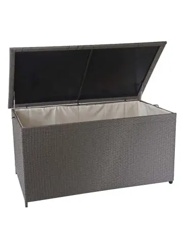– Markeninhaber TÜV-Süd QM zertifiziert mit Nr. 12 100 59626 TMS für Qualitäts-Management in Deutschland – Lieferumfang: 1x Poly-Rattan Truhe – Variante wählbar: Premium oder Basic in verschiedenen Größen – Auch als Buffettisch nutzbar – BSCI-Sozialstandards geprüft – Premium: Müheloses Öffnen und Schließen durch leichtgängige Hydraulik – Premium: Wasserabweisender und abnehmbarer Bezug – Premium: Bezug mit Klettband befestigt – Premium: Beidseitig mit Griffen, einseitig mit Rollen versehen – Belastbarkeit bis ca. 40 kg – Überstehender Deckelrand schützt besser vor eindringender Nässe – Einlage im Deckel zur Verstärkung und Nässeschutz von oben – Durchgehendes Flechtwerk statt Spritzguss – UV- und wetterbeständigMaße Basic und Premium S (ca.):Höhe aufgeklappt: 97 cmHöhe zugeklappt: 51 cmBreite: 100 cmTiefe: 50 cmInnenmaße (HxBxT): 41x93x45 cmVolumen: 170l Maße Basic und Premium M (ca.):Höhe aufgeklappt: 105 cmHöhe zugeklappt: 51 cmBreite: 115 cmTiefe: 59 cmInnenmaße (HxBxT): 43x108x54 cmVolumen: 250l Maße Basic und Premium L (ca.):Höhe aufgeklappt: 110 cmHöhe zugeklappt: 63 cmBreite: 135 cmTiefe: 52 cmInnenmaße (HxBxT): 52x129x48 cmVolumen: 320l Maße Basic und Premium XXL (ca.):Höhe aufgeklappt: 168 cmHöhe zugeklappt: 80 cmBreite: 160 cmTiefe: 94 cmInnenmaße (HxBxT): 70x153x89 cmVolumen: 950l Material:Geflecht: Poly-RattanGestell: Pulverbeschichteter StahlEinlage im Deckel: PVCBezug (nur bei Premuim): Textil (100% Polyester), 180g/m² HINWEIS zum Volumen:Wir geben Ihnen die nutzbaren Liter an. Viele Anbieter geben angebliche Liter an, die bestenfalls ein Außenvolumen darstellen – darin wären dann aber sogar Griffe und heraus stehende Deckel integriert. Das ist für Sie nicht nutzbar. Von einer derart geschönten Darstellung nehmen wir Abstand. Die Truhe bietet jede Menge Stauraum für Ihre Gartenmöbel-Auflagen oder auch andere Dinge, die schnell, geschützt und gut belüftet verstaut werden sollen. Auch als Buffettisch gibt sie ein gutes Bild ab. Für mehr Stabilität ist der Deckel mit einer PVC-Einlage verstärkt, so dass man diese Truhe auch sehr gut als Ablage nutzen kann. Von Spielzeug bis hin zu Kissen, alles findet seinen Platz in diesen Truhen. Alles, was sonst nur im Weg liegt, wird verpackt. Frei nach dem Motto „“Klappe zu, Affe tot“