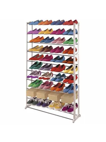 – Markeninhaber TÜV-Süd QM zertifiziert mit Nr. 12 100 59626 TMS für Qualitäts-Management in Deutschland – 72x25x140cm – praktisch und robust – Seitenteile aus weißem Kunststoff – Metallstreben – für 40 Paar SchuheEs handelt sich um ein Kunstoff Schuhregal welches Platz für sage und schreibe 40 Paar Schuhe bietet. Ein Traum für alle Frauen!Versandzustand: Teilmontiert–Sicherheitshinweise für Teilartikel mit Artikelnummer 9845 Dieser Artikel ist ein Schrank und sollte nur als solcher benutzt werden. Der Artikel ist nur für den Innenbereich geeignet. Überladen Sie den Artikel nicht. Vorsicht: Verletzungsgefahr! Setzen, stellen oder stützen Sie sich nicht auf den Artikel.Vorsicht Erstickungsgefahr! Verpackungsmaterial, wie Plastikbeutel, gehören nicht in Kinderhände. Bitte von Babys und Kleinkindern fernhalten! Nicht über den Kopf ziehen! Vorsicht: Verschluckungsgefahr! Achtung dieser Artikel kann verschluckbare Kleinteile enthalten! Halten Sie die Kleinteile von Kindern fern! Prüfen Sie den Artikel regelmäßig alle 3-6 Monate auf Beschädigungen und gelöste Verbindungen. Ziehen Sie lose Schrauben wieder fest an! Sollten Beschädigungen entdeckt werden, darf der Artikel nicht mehr genutzt werden! Warnung: Kippgefahr, Unfallgefahr und Verletzungsgefahr!Ein Möbelstück, das nicht an der Wand befestigt wird, kann wenn es umfällt ein Kind oder einen Erwachsenen schwerwiegend oder sogar tödlich verletzen. Befestigen Sie daher alle Möbel mit Winkeln oder speziellen Kippschutzen (teilweise nicht im Lieferumfang enthalten) an der Wand. Achten Sie dabei immer auf mögliche Kabel oder Rohre die in der Wand verlegt sein können.Benutzen Sie diesen Artikel nur für die bestimmungsgemäße Verwendung, im technisch einwandfreien Zustand und für private Zwecke. Andere Verwendungen gelten als nicht bestimmungsgemäß und können zu schweren Verletzungen und Beschädigungen führen. Für aus bestimmungswidriger Verwendung entstandene Schäden übernimmt der Hersteller keine Haftung.Allgemeine Hinweise: Bitte lesen Sie alle Hinweise sorgfältig durch, bevor Sie den Artikel aufbauen und verwenden. Verwahren Sie die alle Sicherheitsinformationen und Aufbauanleitungen gut auf. Für Ihre eigene Sicherheit und die Ihres Produktes, befolgen Sie bitte die Sicherheitshinweise. Eine falsche Handhabung könnte zu ernsten Verletzungen, beschädigtem Eigentum oder sogar dem Tod hinauslaufen.Pflegehinweise: Verwenden Sie eine weiche Bürste um losen Schmutz zu entfernen. Benutzen Sie niemals Waschmittel oder andere Putzmittel, um den Bezug zu reinigen. Entsorgungshinweise: Entsorgen Sie den Artikel umweltgerecht. Überlegen Sie Alternativen zu Entsorgung wie Spenden oder Verkaufen. Elektrische Artikel gehören nicht in den Hausmüll. Entsorgen Sie diese an einem Recyclinghof für elektrische und elektronische Altgeräte, weitere Informationen erhalten Sie bei Ihrer örtlichen Gemeindeverwaltung. Einlagerungshinweise: Der Artikel sollte trocken und sauber sein, verwahren Sie diesen geschützt in dem Karton in dem er geliefert wurde.
