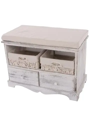 – Markeninhaber TÜV-Süd QM zertifiziert mit Nr. 12 100 59626 TMS für Qualitäts-Management in Deutschland – Inklusive Sitzkissen – Dekorativ – Praktisch – Großer Stauraum – 2 geräumige Schubladen – 2 formstabile Körbe – Vielseitig verwendbar – Stabil – Komplett fertig montiert – Kein Aufbau notwendig – Bezug mit Klettverschluss – Waschbar – Aus massivem PaulowniaholzHübsch hässlich, schick schäbig, Trash ist das neue Neu – und vor allem der allerletzte Schrei!! Wir präsentieren: den Shabby-Look. Lassen Sie sich von der lädiert anmutenden Oberfläche nicht täuschen, die Produkte dieser Serie sind qualitativ hochwertig verarbeitet und wurden nur aus den besten Materialien gefertigt. Die Holzelemente wurden hauptsächlich aus der Paulownie hergestellt, einem auch schon in Europa kultivierten Wertholzbaum, der aufgrund seiner Leichtigkeit und hohen Stabilität auch als das Aluminium der Hölzer bezeichnet wird. Das bei Teilen dieser Serie verwendete Geflecht wiederum, wurde aus Maisstroh gefertigt. Die gebürstete Oberfläche verleiht jedem einzelnen unserer Shabby-Produkte einen ganz eigenen, individuellen Used-Look, der einerseits rustikal, andererseits aber auch spielerisch leicht wirkt und sich somit nahtlos in jede Umgebung einfügt, es aber auch schafft Akzente zu setzen. Ihrer Kreativität sind hier keinerlei Grenzen gesetzt. Die universelle Möbelserie im Vintage-Look. Bestellen, auspacken, fertig – die Produkte dieser Serie werden fertig montiert geliefert, sodass der lästige Aufbau komplett entfällt. Das Rundum-sorglos-Paket. Diese schicke Sitzbank mit 2 Maiskorb- und 2 Holzschubladen ist ein echter Hingucker und wird jeden Raum aufwerten! Ganz egal ob Sie es im Eingangsbereich, im Wohnzimmer oder im Kinderzimmer platzieren! Es überzeugt überall durch seine 4 geräumigen Schubladen mit denen Ordnung wörtlich zum Kinderspiel wird! Zusätzlicher Vorteil: Der Bezug des Sitzkissens ist Dank des Klettverschlusses abnehmbar und somit waschbar! Die Sitzbank ist den Herausforderungen des Alltags eben durch und durch gewachsen! Eine Sitzbank, welche auch als Kommode absolut durchgeht, die sich sehen lassen kann und in denen Ihre Dinge alle ihren eigenen Platz finden! Gesamtmaße eines Korbes (ca.):Höhe: 11,5 cmBreite: 27 cmTiefe: 28 cm Innenmaße einer Holzschublade (ca.):Höhe: 9,5 cmBreite: 24 cmTiefe: 25 cm Maße des Sitzkissens (ca.):Höhe: 4,5 cmBreite: 62 cmTiefe: 33 cm Material:Rahmen: Paulownia HolzStoffbezug: 80% Baumwolle 20% PolyesterKörbe: MaisstrohVersandzustand: Montiert–Sicherheitshinweise für Teilartikel mit Artikelnummer 30440 Dieser Artikel ist ein Schrank und sollte nur als solcher benutzt werden. Der Artikel ist nur für den Innenbereich geeignet. Überladen Sie den Artikel nicht. Vorsicht: Verletzungsgefahr! Setzen, stellen oder stützen Sie sich nicht auf den Artikel.Vorsicht Erstickungsgefahr! Verpackungsmaterial, wie Plastikbeutel, gehören nicht in Kinderhände. Bitte von Babys und Kleinkindern fernhalten! Nicht über den Kopf ziehen! Vorsicht: Verschluckungsgefahr! Achtung dieser Artikel kann verschluckbare Kleinteile enthalten! Halten Sie die Kleinteile von Kindern fern! Prüfen Sie den Artikel regelmäßig alle 3-6 Monate auf Beschädigungen und gelöste Verbindungen. Ziehen Sie lose Schrauben wieder fest an! Sollten Beschädigungen entdeckt werden, darf der Artikel nicht mehr genutzt werden! Warnung: Kippgefahr, Unfallgefahr und Verletzungsgefahr!Ein Möbelstück, das nicht an der Wand befestigt wird, kann wenn es umfällt ein Kind oder einen Erwachsenen schwerwiegend oder sogar tödlich verletzen. Befestigen Sie daher alle Möbel mit Winkeln oder speziellen Kippschutzen (teilweise nicht im Lieferumfang enthalten) an der Wand. Achten Sie dabei immer auf mögliche Kabel oder Rohre die in der Wand verlegt sein können.Benutzen Sie diesen Artikel nur für die bestimmungsgemäße Verwendung, im technisch einwandfreien Zustand und für private Zwecke. Andere Verwendungen gelten als nicht bestimmungsgemäß und können zu schweren Verletzungen und Beschädigungen führen. Für aus bestimmungswidriger Verwendung entstandene Schäden übernimmt der Hersteller keine Haftung.Allgemeine Hinweise: Bitte lesen Sie alle Hinweise sorgfältig durch, bevor Sie den Artikel aufbauen und verwenden. Verwahren Sie die alle Sicherheitsinformationen und Aufbauanleitungen gut auf. Für Ihre eigene Sicherheit und die Ihres Produktes, befolgen Sie bitte die Sicherheitshinweise. Eine falsche Handhabung könnte zu ernsten Verletzungen, beschädigtem Eigentum oder sogar dem Tod hinauslaufen.Pflegehinweise: Verwenden Sie eine weiche Bürste um losen Schmutz zu entfernen. Benutzen Sie niemals Waschmittel oder andere Putzmittel, um den Bezug zu reinigen. Entsorgungshinweise: Entsorgen Sie den Artikel umweltgerecht. Überlegen Sie Alternativen zu Entsorgung wie Spenden oder Verkaufen. Elektrische Artikel gehören nicht in den Hausmüll. Entsorgen Sie diese an einem Recyclinghof für elektrische und elektronische Altgeräte, weitere Informationen erhalten Sie bei Ihrer örtlichen Gemeindeverwaltung. Einlagerungshinweise: Der Artikel sollte trocken und sauber sein, verwahren Sie diesen geschützt in dem Karton in dem er geliefert wurde.