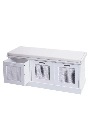 – Markeninhaber TÜV-Süd QM zertifiziert mit Nr. 12 100 59626 TMS für Qualitäts-Management in Deutschland – Mit drei Staufächern – BSCI-Sozialstandards geprüft – Inkl. Sitzpolster – Polsterbezug mit Reißverschluss – Aufbewahrungsboxen vollständig herausnehmbar – Maximale Belastbarkeit Schubfächer: 10 kg – Maximale Belastbarkeit Sitzfläche: 100 kg- Diese Sitz-Kommode überzeugt nicht nur durch ihr schlichtes Design. Dank den drei praktischen Aufbewahrungsboxen verfügt sie über reichlich Unterbringungsmöglichkeiten für Ihre alltäglichen Gebrauchsgegenstände wie Taschen, Regenschirme oder Ähnliches.- Die schicke Polsterbank ist in Ihrem Wohnbereich ein echter Blickfang und setzt extravagante Akzente in Ihre heimischen vier Wände. Durch die weiche Polster-Auflage ist ein bequemes Verweilen garantiert. Maße (HxBxT) ca.:Gesamt: 47x110x40 cmAußenmaß Staufach: 32x33x36 cmInnenmaß Staufach: 31x31x33 cmPolster: 4x105x38 cmSitzbreite: 107 cmSitztiefe: 38 cm Material:Gestell: Paulownia Holz und MDF aus PappelholzPolsterbezug: Stoff/Textil (50% Polyester und 50% Baumwolle)Gitter: Rattan Diese praktische und schicke Garderobenbank mit drei Aufbewahrungsboxen ist ein echter Hingucker und wird jeden Raum aufwerten. Egal ob im Flur, Schlafzimmer, Kinderzimmer oder Bad, diese Sitzbank findet in nahezu jedem Wohnbereich eine vielseitige und praktische Verwendung. Sie verfügt über insgesamt drei Staufächer, welche herausnehmbar sind beliebig genutzt werden können. So findet hier jeder Schal, jeder Regenschirm, jede Einkaufstasche und noch vieles mehr seinen Platz! Die drei Holzboxen, welche genau in die unteren Staufächer passen, verleihen der Sitz-Kommode Aufgeräumtheit und Ordentlichkeit und lassen jedes Chaos verschwinden. Die Holzelemente wurden hauptsächlich aus Palowniaholz hergestellt, einem auch schon in Europa kultivierten Wertholz, das aufgrund seiner Leichtigkeit und hohen Stabilität auch als das Aluminium der Hölzer bezeichnet wird. Der Hersteller ist erfolgreich BSCI-geprüft. Dabei wird der Hersteller verpflichtet, sich an soziale Standards zu halten. Noten von A (sehr gut) – E (ungenügend) Soziales Managementsystem (Note C), Arbeitnehmerschutz (A), Recht auf Kollektivverhandlungen/Vereinigungsfreiheit (A), Keine Diskriminierung (A), Angemessene Vergütung (B), Angemessene Arbeitszeit (D), Arbeitssicherheit und Gesundheitsschutz (A), Keine Kinderarbeit (A), Arbeitsschutz für Jugendliche (A), Keine Scheinbeschäftigung (A), Zwangsarbeit (A), Umweltschutz (A), Ethisches Geschäftsverhalten (A) Auditor: Amfori: 156-027118-000, Audit Id: 11600007Versandzustand: Zerlegt–Sicherheitshinweise für Teilartikel mit Artikelnummer 80904 Dieser Artikel ist eine Sitzgelegenheit und dient ausschließlich zum Sitzen. Der Artikel ist nur für den Innenbereich geeignet. Setzen Sie sich nicht auf die Armlehnen oder Außenkanten des Artikels! Vorsicht: Verletzungsgefahr! Nicht kippeln! Nicht rutschen! Nicht schaukeln! Vorsicht: Verletzungsgefahr! Das Wechseln der Gasdruckfeder ist möglich. Jedoch sollten Sie nie versuchen diese zu öffnen.Vorsicht Erstickungsgefahr! Verpackungsmaterial, wie Plastikbeutel, gehören nicht in Kinderhände. Bitte von Babys und Kleinkindern fernhalten! Nicht über den Kopf ziehen! Vorsicht: Verschluckungsgefahr! Achtung dieser Artikel kann verschluckbare Kleinteile enthalten! Halten Sie die Kleinteile von Kindern fern! Prüfen Sie den Artikel regelmäßig alle 3-6 Monate auf Beschädigungen und gelöste Verbindungen. Ziehen Sie lose Schrauben wieder fest an! Sollten Beschädigungen entdeckt werden, darf der Artikel nicht mehr genutzt werden! Der Artikel ist keine Steighilfe / Tritt, stellen oder springen Sie nicht auf den Artikel! Vorsicht: Kippgefahr & Verletzungsgefahr!Benutzen Sie diesen Artikel nur für die bestimmungsgemäße Verwendung, im technisch einwandfreien Zustand und für private Zwecke. Andere Verwendungen gelten als nicht bestimmungsgemäß und können zu schweren Verletzungen und Beschädigungen führen. Für aus bestimmungswidriger Verwendung entstandene Schäden übernimmt der Hersteller keine Haftung.Allgemeine Hinweise: Bitte lesen Sie alle Hinweise sorgfältig durch, bevor Sie den Artikel aufbauen und verwenden. Verwahren Sie alle Sicherheitsinformationen und Aufbauanleitungen gut auf. Für Ihre eigene Sicherheit und die Ihres Produktes, befolgen Sie bitte die Sicherheitshinweise. Eine falsche Handhabung könnte zu ernsten Verletzungen, beschädigtem Eigentum oder sogar dem Tod hinauslaufen.Pflegehinweise: Saugen Sie die Polstermöbel regelmäßig ab. Hat der Artikel einen Bezug pflegen und reinigen Sie diesen entsprechend nach Material (Textil, Leder, Kunstleder). Besteht ihr Möbel aus Holz nutzen Sie einen Staubwedel zur Reinigung. Für alle anderen Oberflächen und bei stärkerem Schmutz können Sie ein nebelfeuchtes Baumwolltuch verwenden. Keinesfalls sollten Sie scharfe oder scheuernde Reiniger verwenden, diese können Schäden verursachen. Für Möbel im Bad: Wasser und Kondenswasser sofort abwischen! Entsorgungshinweise: Entsorgen Sie den Artikel umweltgerecht. Überlegen Sie Alternativen zu Entsorgung wie Spenden oder Verkaufen. Elektrische Artikel gehören nicht in den Hausmüll. Entsorgen Sie diese an einem Recyclinghof für elektrische und elektronische Altgeräte, weitere Informationen erhalten Sie bei Ihrer örtlichen Gemeindeverwaltung. Einlagerungshinweise: Der Artikel sollte trocken und sauber sein, verwahren Sie diesen geschützt in dem Karton in dem er geliefert wurde.