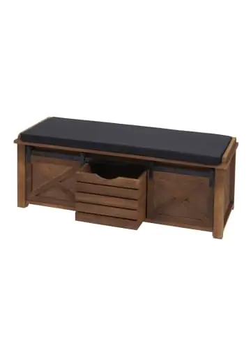 – Markeninhaber TÜV-Süd QM zertifiziert mit Nr. 12 100 59626 TMS für Qualitäts-Management in Deutschland – Inkl. Aufbewahrungsbox – Mit Schiebetüren – Drei Staufächer – Bequemes Sitzpolster – Kissenbezug mit Reißverschluss – Maximale Belastbarkeit: 150 kg – Komplett fertig montiert- Diese bequeme Polsterbank ist in Ihrem Wohnnbereich ein echter Blickfang. Mit der Materialkombination aus Metall und Holz setzt die schicke Garderobenbank extravagante Akzente in Ihre heimischen vier Wände.- Die Bank im Vintage-Design ist nicht nur optisch ansprechend, sondern verfügt auch über reichlich Stauraum, die durch die raffinierten Schiebetüren leicht erreichbar sind. Zudem besitzt die Sitzbank eine Holzbox für optimale Aufbewahrungsmöglichkeiten. Maße (HxBxT) (ca.):Gesamt: 43x102x33 cmAufbewahrungsbox: 26x29x27 cmSitzhöhe: 43 cmSitzbreite: 77 cmSitztiefe: 31 cmPolsterdicke: 4 cm Material:Gestell: Paulownia- und PappelholzBezug: Stoff/Textil (50% Polyester, 50% Baumwolle)Kissenfüllung: Schaumstoff (100% Polyethylen)Türführung: Metall Die Vielfältigkeit der Sitz-Kommode mit ihrer Aufbewahrungsbox bringt durch ihre einzigartige Aufmachung nicht nur einen extravaganten Charme in Ihre Räumlichkeiten, sondern bietet zum anderen auch ausreichend Unterbringungsmöglichkeiten. Zudem verfügt die Bank eine dicke Polsterauflage die ein gemütliches Sitzen ermöglicht. Die Türführung aus Metall verleiht dem Schubladenschrank zusätzlich noch das gewisse Etwas. Das Sideboard verfügt drei Staufächer und eine Holzbox, die genau in die Staufächer passt und beliebig genutzt werden kann. Dank der praktischen Schiebetüren kann der Korb durch eine mittige Öffnung einfach herausgezogen und individuell in ein Staufach umgestellt werden. Die Türen der Sitzbank können einfach und nach Belieben verschoben werden. So findet hier jeder Schuh, jeder Regenschirm, jede Einkaufstasche und noch vieles mehr seinen Platz und lassen jedes Chaos verschwinden. Egal ob im Flur, Schlafzimmer, Kinderzimmer oder Bad, diese Sitzbank findet in jedem Wohnbereich eine vielseitige und praktische Verwendung. Lassen Sie sich von der lädiert anmutenden Oberfläche nicht täuschen! Shabby ist ein Einrichtungsstil, bei dem Möbel mit sichtbaren Gebrauchsspuren sowie eine Mischung aus Flohmarktkäufen und Erbstücken zum Konzept gehören. Die Produkte dieser Serie sind qualitativ hochwertig verarbeitet und wurden nur aus den besten Materialien gefertigt. Die Holzelemente wurden hauptsächlich aus der Paulownie hergestellt, einem auch schon in Europa kultivierten Wertholzbaum, der aufgrund seiner Leichtigkeit und hohen Stabilität auch als das Aluminium der Hölzer bezeichnet wird. Bestellen, auspacken, fertig – alle Produkte dieser HWC-H53 Serie werden fertig montiert geliefert, sodass der lästige Aufbau komplett entfällt. Das Rundum-sorglos-Paket. Versandzustand: Montiert–Sicherheitshinweise für Teilartikel mit Artikelnummer 73596 Dieser Artikel ist eine Sitzgelegenheit und dient ausschließlich zum Sitzen. Der Artikel ist nur für den Innenbereich geeignet. Setzen Sie sich nicht auf die Armlehnen oder Außenkanten des Artikels! Vorsicht: Verletzungsgefahr! Nicht kippeln! Nicht rutschen! Nicht schaukeln! Vorsicht: Verletzungsgefahr! Das Wechseln der Gasdruckfeder ist möglich. Jedoch sollten Sie nie versuchen diese zu öffnen.Vorsicht Erstickungsgefahr! Verpackungsmaterial, wie Plastikbeutel, gehören nicht in Kinderhände. Bitte von Babys und Kleinkindern fernhalten! Nicht über den Kopf ziehen! Vorsicht: Verschluckungsgefahr! Achtung dieser Artikel kann verschluckbare Kleinteile enthalten! Halten Sie die Kleinteile von Kindern fern! Prüfen Sie den Artikel regelmäßig alle 3-6 Monate auf Beschädigungen und gelöste Verbindungen. Ziehen Sie lose Schrauben wieder fest an! Sollten Beschädigungen entdeckt werden, darf der Artikel nicht mehr genutzt werden! Der Artikel ist keine Steighilfe / Tritt, stellen oder springen Sie nicht auf den Artikel! Vorsicht: Kippgefahr & Verletzungsgefahr!Benutzen Sie diesen Artikel nur für die bestimmungsgemäße Verwendung, im technisch einwandfreien Zustand und für private Zwecke. Andere Verwendungen gelten als nicht bestimmungsgemäß und können zu schweren Verletzungen und Beschädigungen führen. Für aus bestimmungswidriger Verwendung entstandene Schäden übernimmt der Hersteller keine Haftung.Allgemeine Hinweise: Bitte lesen Sie alle Hinweise sorgfältig durch, bevor Sie den Artikel aufbauen und verwenden. Verwahren Sie die alle Sicherheitsinformationen und Aufbauanleitungen gut auf. Für Ihre eigene Sicherheit und die Ihres Produktes, befolgen Sie bitte die Sicherheitshinweise. Eine falsche Handhabung könnte zu ernsten Verletzungen, beschädigtem Eigentum oder sogar dem Tod hinauslaufen.Pflegehinweise: Saugen Polstermöbel regelmäßig ab. Hat der Artikel einen Bezug pflegen und reinigen Sie diesen entsprechend nach Material (Textil, Leder, Kunstleder). Besteht ihr Möbel aus Holz nutzen Sie einen Staubwedel zur Reinigung. Für alle anderen Oberflächen und bei stärkerem Schmutz können Sie ein nebelfeuchtes Baumwolltuch verwenden. Keinesfalls sollten Sie scharfe oder scheuernde Reiniger verwenden, diese können Schäden verursachen. Für Möbel im Bad: Wasser und Kondenswasser sofort abwischen! Entsorgungshinweise: Entsorgen Sie den Artikel umweltgerecht. Überlegen Sie Alternativen zu Entsorgung wie Spenden oder Verkaufen. Elektrische Artikel gehören nicht in den Hausmüll. Entsorgen Sie diese an einem Recyclinghof für elektrische und elektronische Altgeräte, weitere Informationen erhalten Sie bei Ihrer örtlichen Gemeindeverwaltung. Einlagerungshinweise: Der Artikel sollte trocken und sauber sein, verwahren Sie diesen geschützt in dem Karton in dem er geliefert wurde.