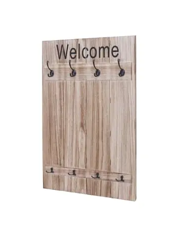 – Markeninhaber TÜV-Süd QM zertifiziert mit Nr. 12 100 59626 TMS für Qualitäts-Management in Deutschland – Wandgarderobe mit 8 Haken – BSCI-Sozialstandards geprüft – Kombinierbar mit unserer Shabby-Serie C89 – 4 große und 4 kleine HakenGesamtmaße (ca.):Höhe: 91 cmBreite: 60 cmTiefe (mit Kleiderhaken): 8 cmTiefe (ohne Kleiderhaken): 3 cm Hübsch hässlich, schick schäbig, Trash ist das neue Neu – und vor allem der allerletzte Schrei!! – Mit dieser Garderobe können Sie jede Wand praktisch und dekorativ aufwerten! Durch den Shabby-Look wirkt jeder Flur, oder das Schlafzimmer viel wohnlicher. Acht Haken machen es möglich, Ihre Kleidung schnell greifbar und übersichtlich unterzubringen.- Die gebürstete Oberfläche verleiht diesem Garderobenpaneel einen ganz eigenen, individuellen Used-Look, der einerseits rustikal, andererseits aber auch spielerisch leicht wirkt. Somit fügt sich diese Wandgarderobe nahtlos in jede Umgebung ein. Maße (HxBxT) (ca.):Gesamt: 90x60x8 cmTiefe ohne Kleiderhaken: 2,5 cm Material:Paneel: PaulowniaholzHaken: Metall Lassen Sie sich von der lädiert anmutenden Oberfläche nicht täuschen, die Produkte dieser Serie sind qualitativ hochwertig verarbeitet und wurden nur aus den besten Materialien gefertigt. Die Holzelemente wurden aus der Paulownie hergestellt, einem auch schon in Europa kultivierten Wertholzbaum, der aufgrund seiner Leichtigkeit und hohen Stabilität auch als das Aluminium der Hölzer bezeichnet wird. Bestellen, auspacken, fertig – die Produkte dieser Serie werden fertig montiert geliefert, sodass der lästige Aufbau komplett entfällt. Das Rundum-sorglos-Paket. Darüber hinaus ist diese hübsche Wandgarderobe mit vielen weiteren Artikeln unserer Shabby-Serie C89 kombinierbar. Der Hersteller ist erfolgreich BSCI-geprüft. Dabei wird der Hersteller verpflichtet, sich an soziale Standards zu halten. Noten von A (sehr gut) – E (ungenügend) Soziales Managementsystem (Note D), Arbeitnehmerschutz (A), Recht auf Kollektivverhandlungen/Vereinigungsfreiheit (A), Keine Diskriminierung (A), Angemessene Vergütung (B), Angemessene Arbeitszeit (D), Arbeitssicherheit und Gesundheitsschutz (B), Keine Kinderarbeit (A), Arbeitsschutz für Jugendliche (A), Keine Scheinbeschäftigung (A), Zwangsarbeit (A), Umweltschutz (A), Ethisches Geschäftsverhalten (A) Auditor: Amfori, DBID: 351271, Audit Id: 165443Versandzustand: Montiert–Sicherheitshinweise für Teilartikel mit Artikelnummer 61924 Dieser Artikel ist eine Wandgarderobe und sollte nur als solche verwendet werden. Der Artikel ist nur für den Innenbereich geeignet. Überladen Sie den Artikel nicht. Vorsicht: Verletzungsgefahr! Beim Bohren in Wand oder Decke auf Kabel, Rohre sowie Gas- und Wasser-leitungen achten!Vorsicht Erstickungsgefahr! Verpackungsmaterial, wie Plastikbeutel, gehören nicht in Kinderhände. Bitte von Babys und Kleinkindern fernhalten! Nicht über den Kopf ziehen! Vorsicht: Verschluckungsgefahr! Achtung dieser Artikel kann verschluckbare Kleinteile enthalten! Halten Sie die Kleinteile von Kindern fern! Prüfen Sie den Artikel regelmäßig alle 3-6 Monate auf Beschädigungen und gelöste Verbindungen. Ziehen Sie lose Schrauben wieder fest an! Sollten Beschädigungen entdeckt werden, darf der Artikel nicht mehr genutzt werden! Benutzen Sie diesen Artikel nur für die bestimmungsgemäße Verwendung, im technisch einwandfreien Zustand und für private Zwecke. Andere Verwendungen gelten als nicht bestimmungsgemäß und können zu schweren Verletzungen und Beschädigungen führen. Für aus bestimmungswidriger Verwendung entstandene Schäden übernimmt der Hersteller keine Haftung.Allgemeine Hinweise: Bitte lesen Sie alle Hinweise sorgfältig durch, bevor Sie den Artikel aufbauen und verwenden. Verwahren Sie die alle Sicherheitsinformationen und Aufbauanleitungen gut auf. Für Ihre eigene Sicherheit und die Ihres Produktes, befolgen Sie bitte die Sicherheitshinweise. Eine falsche Handhabung könnte zu ernsten Verletzungen, beschädigtem Eigentum oder sogar dem Tod hinauslaufen.Pflegehinweise: Saugen Polstermöbel regelmäßig ab. Hat der Artikel einen Bezug pflegen und reinigen Sie diesen entsprechend nach Material (Textil, Leder, Kunstleder). Besteht ihr Möbel aus Holz nutzen Sie einen Staubwedel zur Reinigung. Für alle anderen Oberflächen und bei stärkerem Schmutz können Sie ein nebelfeuchtes Baumwolltuch verwenden. Keinesfalls sollten Sie scharfe oder scheuernde Reiniger verwenden, diese können Schäden verursachen. Für Möbel im Bad: Wasser und Kondenswasser sofort abwischen! Entsorgungshinweise: Entsorgen Sie den Artikel umweltgerecht. Überlegen Sie Alternativen zu Entsorgung wie Spenden oder Verkaufen. Elektrische Artikel gehören nicht in den Hausmüll. Entsorgen Sie diese an einem Recyclinghof für elektrische und elektronische Altgeräte, weitere Informationen erhalten Sie bei Ihrer örtlichen Gemeindeverwaltung. Einlagerungshinweise: Der Artikel sollte trocken und sauber sein, verwahren Sie diesen geschützt in dem Karton in dem er geliefert wurde.