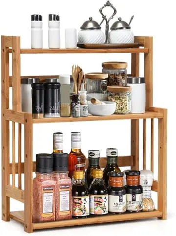 Beschreibung: Falls Sie sich dem Chaos in Küche oder Bad gegenüber machtlos fühlen, ist dieses 3-stufige Bambusregal die perfekte Lösung. Das offene Regal macht Ihnen das Nehmen und Verstauen von Gegenständen bequem und einfach. Sie können die Höhe des mittleren und unteren Regals verstellen, um Gewürzflaschen, Kosmetika oder Pflanzen mit unterschiedlichen Größendort abzulegen. Die glatte Oberfläche lässt sich leicht mit einem weichen, trockenen Tuch reinigen, was Ihnen bei der Pflege Zeit und Energie spart. Egal ob im Badezimmer, im Wohnzimmer, im Arbeitszimmer oder in der Küche, unser 3-stöckiges Gewürzregal wird Sie nie im Stich lassen.Eigenschaften: 3-stöckiges Bambusregal bietet reichlich Stauraum 100% natürlicher Bambus, wasserdicht und kratzfest Glatte Oberfläche ohne Graten Stabilität und Standfestigkeit Verstellbare Regalböden ermöglichen es Ihnen, Gegenstände ihrer Größe nach anzuordnen Geeignet für Küche, Wohnzimmer, Arbeitszimmer, Schlafzimmer, Badezimmer Kann für Gewürzflaschen, Bücher, Kosmetika, Pflanzen, Toilettenartikel usw.genutzt werden Leicht zu montieren Natürliche Textur, hübsches Aussehen und kompaktes Design für Ihre Zufriedenheit Material: Bambus Gesamtmaße: 41,5 x 18 x 50cm Maße oberes Regal: 39 x 10 cm Maße unteres Regal: 39 x 17,5 cm Gesamtgewicht: 2,6 kg Belastbarkeit: 20 kgLieferungsumfang: 1 x Gewürzregal