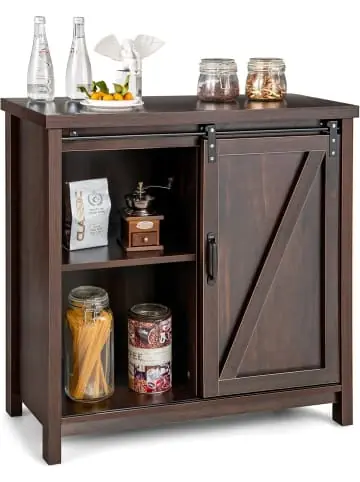 Beschreibung: Mit einer breiten Arbeitsfläche und 4 Aufbewahrungsfächern bietet dieser Küchenschrank ausreichend Platz für Geschirr, Töpfe, Öfen, Teller und vieles mehr. Im Vergleich zu anderen gewöhnlichen Schränken verwendet dieser Schrank eine Schiebewand-Tür, um einfachen Zugang zu den Gegenständen zu ermöglichen und Ihr Zuhause zu dekorieren. Die Kombination aus rustikalem Aussehen und funktionaler Nützlichkeit macht ihn zu einer perfekten Ergänzung für jedes bestehende Möbelstück.Eigenschaft: Schiebewand-Tür definiert Ihren versteckten Stauraum und sorgt für einfachen Zugang 80 x 40 cm große Arbeitsfläche zeigt alle Arten von Gegenständen Großer Schrank mit 4 Fächern erfüllt unterschiedliche Aufbewahrungsbedürfnisse Hochwertiges, verarbeitetes Holz für außergewöhnliche Haltbarkeit Glatter Schieber und praktischer Griff für einfachere Bedienung Retro-Stil und Bauernhaus-Schiebewand-Tür verleihen Ihrem Raum eine elegante Note Kann im Wohnzimmer, in der Küche, im Schlafzimmer, im Flur und mehr verwendet werden Wasserdichte Oberfläche für problemlose Wartung im Alltag Material: Verarbeitetes Holz Gesamtmaße: 80 x 40 x 82 cm (L x B x H) Gewichtskapazität der Arbeitsfläche: 30 kg Gewichtskapazität des mittleren Regals: 10 kg Gewichtskapazität des unteren Regals: 20 kg Nettogewicht: 23,5 kgLieferungsumfang: 1 x Buffet Aufbewahrungsschrank 1 x Anleitung