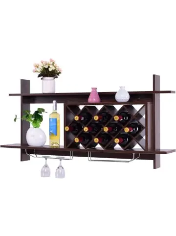 Beschreibung: Dieser stilvolle Weinflaschenhalter ist Platzwunder und Blickfang gleichermaßen. Weisen Sie Ihrem Lieblingswein einen Ehrenplatz zu. Die Weinablage bietet Patz für 10 Flaschen des edlen Tropfens. Darunter können Sie Weingläser kopfüber in die dafür vorgesehenen Halter hängen. Das ist praktisch und sieht stilvoll aus. Der Flaschenhalter kann unkompliziert an die Wand montiert werden. Die fein verzweigte Maserung sowie der warme Holzton sorgen für den natürlich-rustikalen Charakter und machen das Weinregal zum dekorativen Blickfang.Eigenschaften: Metallhalter für Weingläser Platz für 10 Flaschen Wein Weinregal mit feiner Maserung in schönem, rustikalem Landhausstil Zur Montage an die Wand Material: MDF & Edestahl Maße: 120*20*58,5cm (L*B*H) Gewicht: 12,6kgLieferumfang: 1 x Weinregal mit 2 Metallhalter 1 x Anleitung