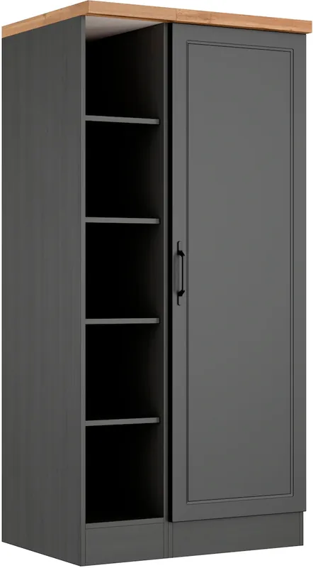 Hochwertig MDF-Fronten in modernen Landhausstil. Beliebig um weitere Schränke erweiterbar. Viel Stauraum. Schwarze Bügelgriffe aus Metall. Made in Germany