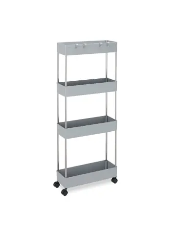 Der Rollwagen ist das perfekte Möbelstück für Bad oder Küche, um auch in engen Nischen und Ecken praktischen Stauraum zu schaffen. Mit 4 Ablagen bietet das schmale Schieberegal ausreichend Platz für Badutensilien, Küchenzubehör und andere Dinge des Alltags, an den 4 Haken lassen sich Hand- und Geschirrtücher aufhängen. Dank des offenen Designs und der 4 Rollen lässt sich der Nischenrollwagen bequem hin und her schieben und Du hast die verstauten Utensilien sofort griffbereit.Nischenwagen im Detail – Maße H x B x T: ca. 98 x 15,5 x 40,5 cm – Innenmaße Fächer H x B x T: ca. 6,5 x 14,5 x 40 cm – Abstand Fächer: ca. 26,5 / 31,5 cm – Traglast: max. 8 kg – Gewicht: ca. 1,6 kg – Material: Kunststoff, Edelstahl – In verschiedenen FarbenSchmales Nischenregal mit Rollen – Ideal für kleine Badezimmer und schmale Küchen – Zum Verstauen von Putzmitteln, Küchenzubehör uvm. – 4 Haken zum Aufhängen von Geschirr- und Handtüchern – Passt dank geringer Breite perfekt in Nischen – Platzsparregal mit 4 Rollen zum leichten Verschieben – Einfacher Aufbau dank praktischem Stecksystem – Aus pflegeleichtem Kunststoff für schnelle ReinigungLieferumfang – 1x Nischenordnungswagen in Einzelteilen – 4x Haken – Mit Anleitung – Dekoartikel sind im Lieferumfang nicht enthalten