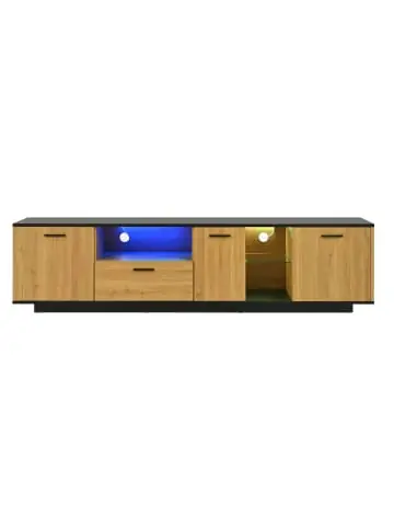 Dieser TV-Schrank besticht durch seine elegante Kombination aus Holz- und Schwarzoptik und schafft einen ruhigen, modernen Look. Mit 16 variablen LED-Farben bringt er zusätzlich Atmosphäre in Ihr Wohnzimmer. Ausgestattet mit drei Türen, zwei Glastrennwänden und einer Schublade bietet er viel Platz für Unterhaltungselektronik, Bücher, Dekorationen und mehr.- Drei Türen, eine Schublade und Glastrennwände bieten großzügigen Stauraum. – Stilvolle Farbkombination aus Holz und Schwarz für ein elegantes Design. – Hochwertiges MDF-Material sorgt für Langlebigkeit. – Robuste Basis schützt vor Beschädigungen beim Türöffnen. – Qualitäts-Scharniere und Gleitschienen garantieren sanften und leisen Gebrauch. – 16-farbige LED-Beleuchtung, steuerbar per Bluetooth-App.Technische Daten Maße: 180 x 40 x 45 cm (L x B x H) Farbe: Schwarz & Holz Montagezeit: 30–60 Minuten (empfohlen für 2 Personen) Werkzeuge: Alle benötigten Werkzeuge inklusive Packstücke: 2 Material: MDF Nettogewicht: 35,5 kg Oberfläche: Matt (kein Hochglanz)