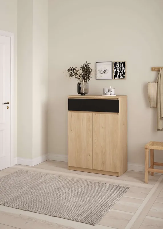 Moderne Schuhkommode passend für ca. 15 Paar Schuhe Design. Der Naia Schuhschrank repräsentiert minimalistisches Design und Funktionalität. Durch die reduzierte Optik passt er zu jedem Wohnstil. Die Schuhe können hinter den Türen auf den Einlegeböden ordentlich verstaut werden. Die Böden sind verstellbar, so dass auch alle Größen Platz finden.. Die Schublade bietet noch zusätzlichen Platz für Dinge des täglichen Bedarfs.. Made in Denmark