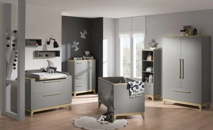 Das Highboard Sten von PAIDI ist eigentlich für das Babyzimmer gedacht. Es macht aber auch im Jugendzimmer oder Wohnraum eine gute Figur. Vor allem durch den modernen Scandi-Look. Das Schiefergrau von Korpus und Front wird durch Akzente aus massiver Eiche abgesetzt. Die schiefergrauen Flächen sind melaminbeschichtet und deshalb kratzerunempfindlich. Sten ist mit zwei Türen und zwei Schubkästen ausgestattet. Alle vier schließen durch Soft-Close leise.