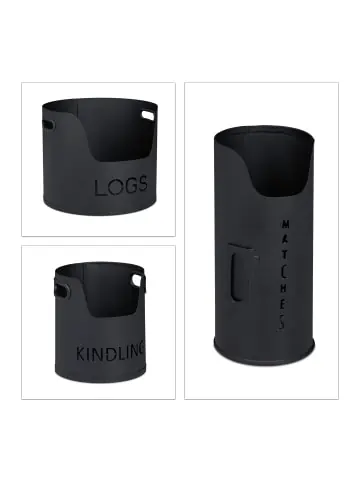 Mit diesem Kaminkorb Set aus Stahl bewahren Sie das nötige Zubehör zum Anzünden Ihres Kamins griffbereit zusammen auf. Platzieren Sie die runden Feuerholzhalter als dekoratives Einrichtungselement neben Ofen oder Kamin und haben Sie Streichhölzer, Anzünd- und Brennholz stets schnell zur Hand. Das moderne Design in Mattschwarz und die Stanzungen machen die Brennholzablagen zudem zu einem echten Hingucker in Ihrem Innenbereich. Dank der Griffe lassen sich die Holztragen einfach transportieren.Kaminholzkorb im Detail – Maße Brennholzablage H x D: ca. 30,5 x 37 cm, ca. 2,5 kg – Maße Anzündholzkorb H x D: ca. 22 x 19 cm, ca. 0,9 kg – Maße Streichholzhalter H x D: ca. 15 x 6,5 cm, ca. 0,1 kg – Max. Traglast Brennholzablage: ca. 50 kg – Max. Traglast Anzündholzkorb: ca. 25 kg – Max. Traglast Streichholzhalter: ca. 10 kg – Material: Stahl – Farbe: SchwarzModernes Kaminkorb 3er Set- Zur Lagerung von Kamin-, Anmachholz und Zündhölzern – Zubehör für Kamin griffbereit aufbewahren – Mit 2 Griffen zum einfachen Transport – Mattschwarzes Design als Hingucker im Innenbereich – Dekorative Stanzungen „Logs