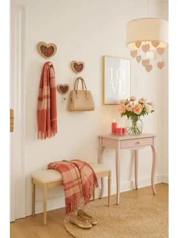 Romantisches 4tlg. Hakenset „Herz“ besehend aus 4 unterschiedlich großen Herzen aus Massivholz (Blauglockenbaum) naturfarben gebeizt und weiß gewischt. In der Mitte mit einem rot kariertem Stoffbezug kombiniert. Haken aus Metall, weiß lackiert, die mit einer runden Holzkugel, bestückt sind. Die schönen Haken lassen sich individuell versetzt an der Wand montieren. Maße ca. cm: (B/H/T) 20/26,5/6,5 // 17/23,5/6,5 // 14/19,5/6 und 11/16,5/5,5 cm.- 4tlg. Haken-Set- Individuell montiertbar- Herzen aus Massivholz
